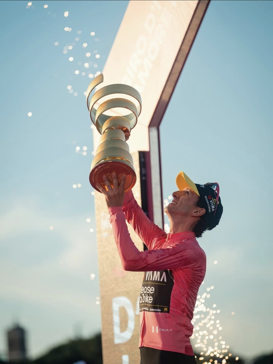 Simon Yates mengangkat trofi Giro d'Italia di Roma tahun lalu.