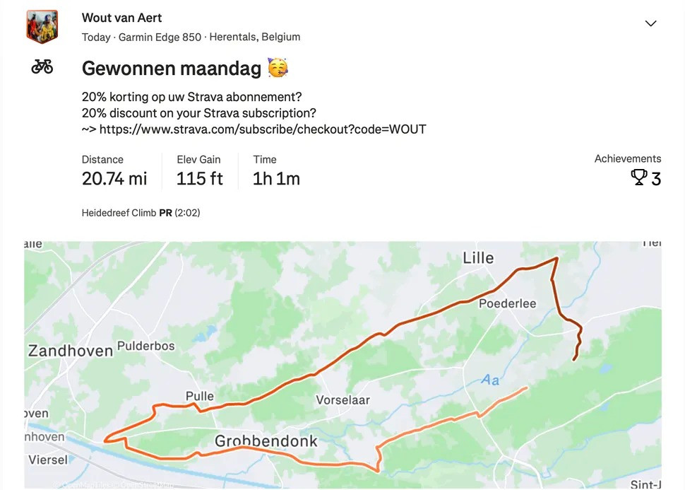 Pembalap Visma-Lease a Bike ini mengunggah perjalanannya sejauh 33 Km di akun sosial medianya, Strava. Lantas menuliskan takarir, "Kemenangan di hari Senin."